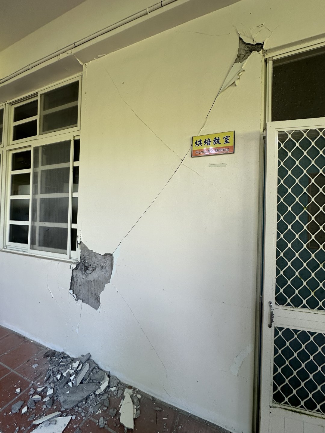 10年前に廃校になった中学校を利用していた同消防署は、4月3日の地震により建物の損壊被害を大きく受け、政府が危険と評価する建物に認定されました。外壁の損壊は30か所近く目視でき、壁の高さ3mまでひびが入る様子、床に敷き詰められたタイルが割れて浮いている様子など、強い揺れが水璉村を襲い、人びとの住環境に大きな影響を与えたことは簡単に想像できます。