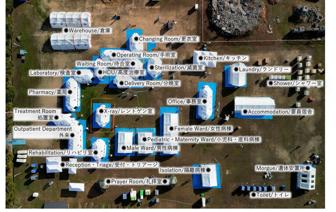 訓練は、2024年12月6日(金)から10日間、兵庫県広域防災センターにて開催されました。約9000㎡の広さのグラウンドにテント29張、約50トンの資機材を展開し、手術室や高度治療室(HDU)、入院病棟などの各病院機能に加え、日赤の病院ERUチームが使用するキッチンやランドリーといった設備、また、現地の宗教に配慮した礼拝室や子ども等へのこころのケア活動のためのスペースに至るまで、実際に現地で使用する各種資機材が立ち並びました。