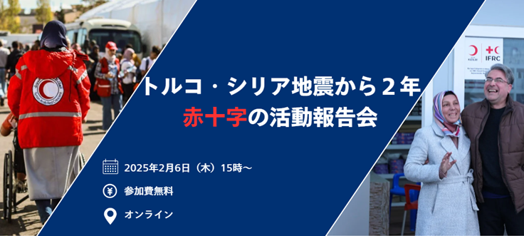 発災からちょうど2年となる2月6日、15時からオンラインで活動報告会を開催します。これまでの国際赤十字の活動をご報告するほか、日赤職員が昨年11月のトルコ出張で見た現地の様子や、保健医療コーディネーターとして現在もシリアで活動する連盟職員へのインタビューも交えて、これまでの歩みと、今の状況をお伝えいたします。こちらのページから、ぜひご参加ください。