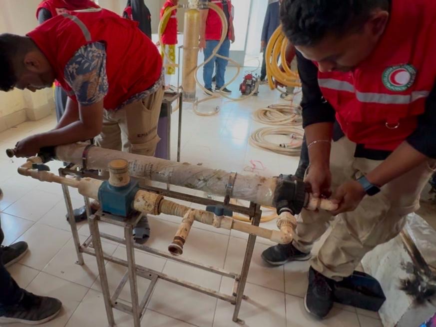また、タンガイルでは、バングラデシュ赤新月社タンガイル支部を訪問し、ボランティアから活動報告を受けた後、資機材倉庫を見学しました。そこで、携帯型浄水装置「MANPACK」の組み立てを実演してもらい、装置の仕組みを詳しく教えてもらうとともに、災害時の給水支援の流れについても確認しました。パーツが多く、複雑な構造に見えましたが、彼らは迷うことなく迅速に組み立てを行い、その対応能力の高さに非常に驚かされました。訪問の中で特に心を打たれたのは、ボランティアたちの姿勢でした。彼らの多くが学生で、勉学に励みながらボランティア活動を行っています。彼らは若いながらも、災害による被害の深刻さや人々の命を脅かすリスクを理解し、強い危機感を持っています。「バングラデシュは毎年のように洪水に見舞われる。地域の人々の命を守るために活動したい」と口々に話していました。彼らは単に支援を受ける立場ではなく、自らの手で地域を守るという強い意志を持っているのです。
