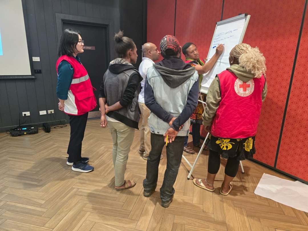 この事業の終わりに向けて、振り返りのワークショップを発災地に近いウェスタン・ハイランズ州支部(参加者数15名)とパプアニューギニア赤本社(参加者6名)で2回行いました。パプアニューギニア赤は12の支部を職員3人と約850人のボランティアで運営しており、発災直後からほとんどの活動がボランティアの力で展開されていました。ワークショップでは、発災直後の初動対応から具体的な活動内容まで、何が良かったのか、改善できる点は何かについて関係者全員で洗い出しました。