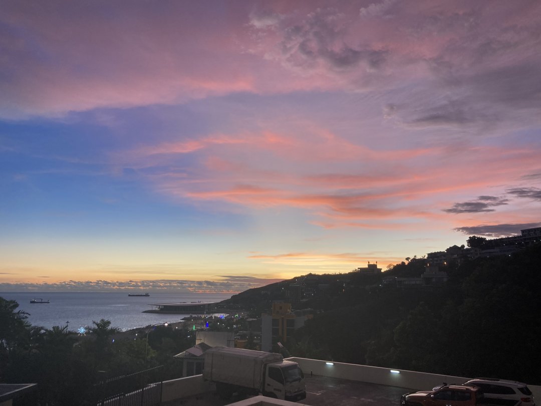 一方で、窓から見える海や山の景色は非常にきれいで豊かな自然に囲まれていることがわかります。特に、自宅から見えるサンゴ海の青の濃淡、夕焼けは毎日見ていても飽きません。