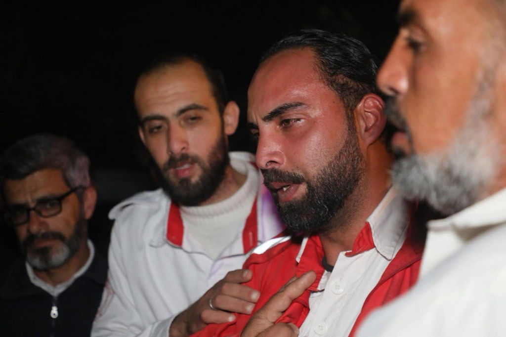 仲間の訃報を受けたパレスチナ赤新月社の救急隊©PRCS