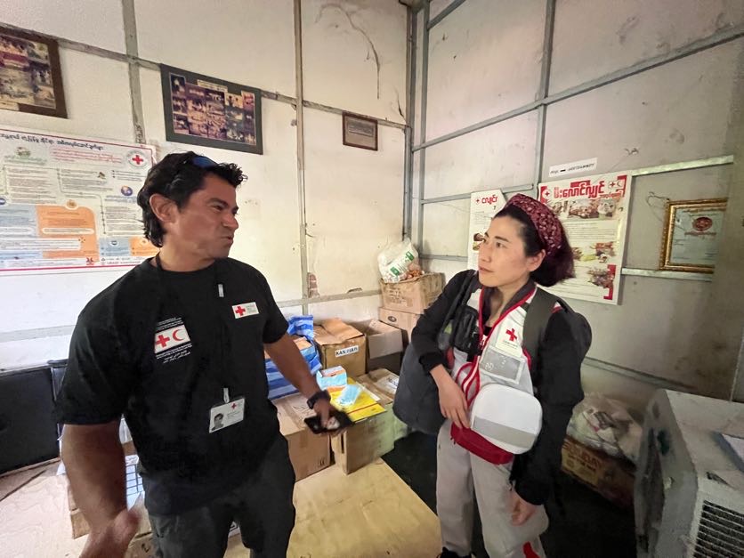 ミャンマー赤十字社マンダレー支部に隣接する倉庫で医薬品の保管状況について聞き取りを行う日赤薬剤師(写真右)©JRCS/MRCS/IFRC