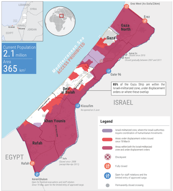 ガザ全域の85%(色付けされた部分)が退避命令または立ち入り制限の対象(OCHAより)