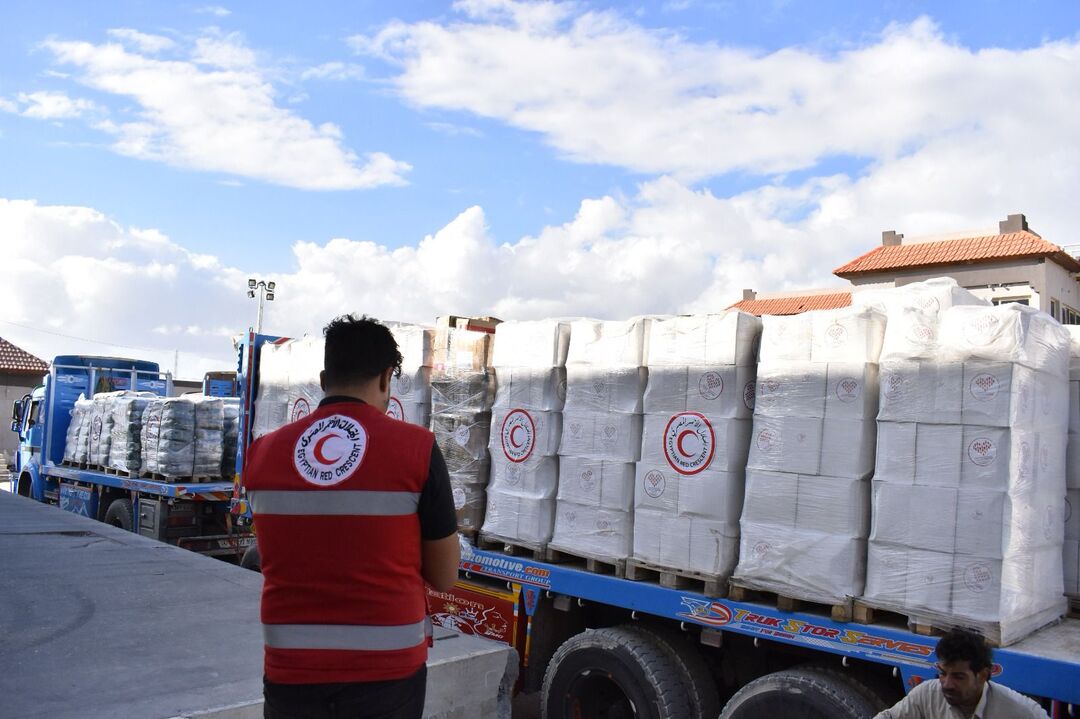 人道支援物資の搬入を行うエジプト赤新月社のスタッフ©ERC