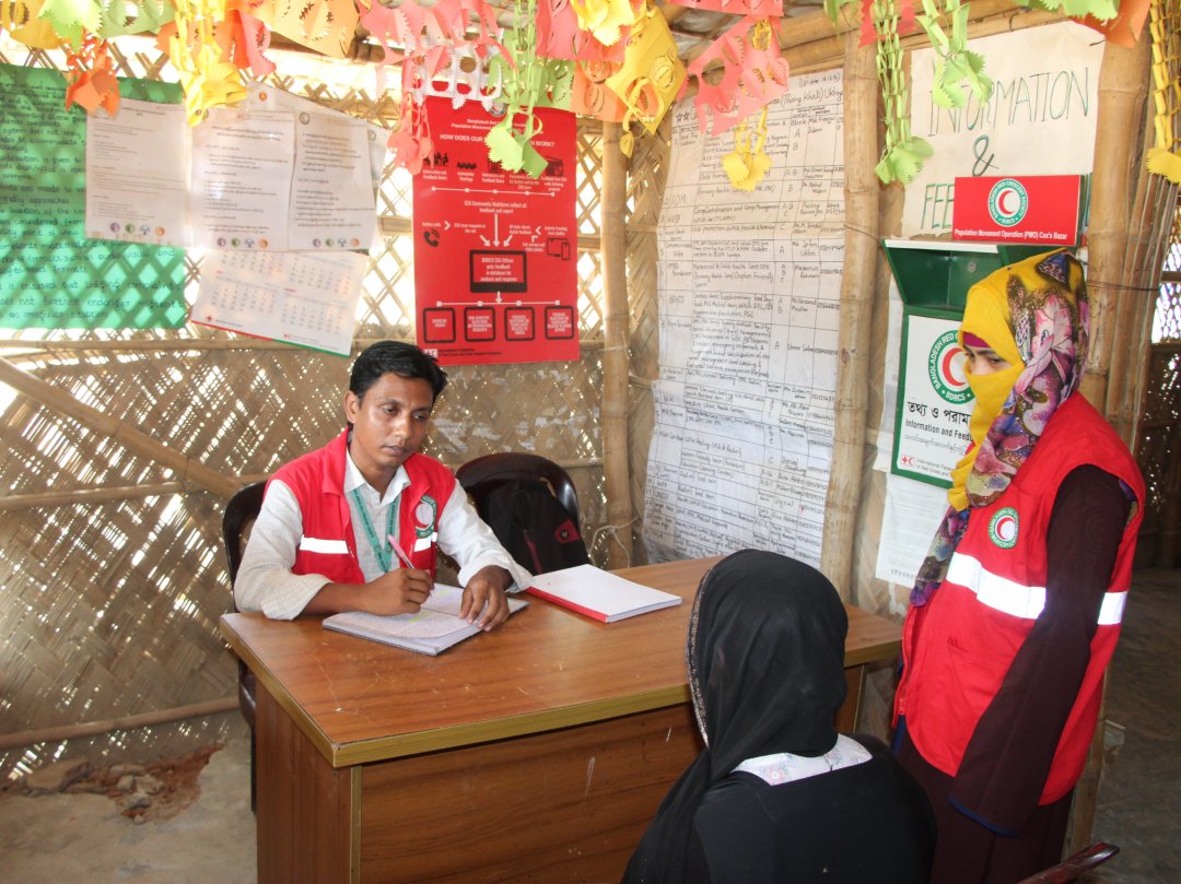住民からのフィードバックを収集し、各支援部門に対して情報提供することで、支援の基準や受益者選定、物資の配分、衛生施設の設置、および支援のフォローアップを行う上で欠かせない活動を行っています。(写真©BDRCS)
