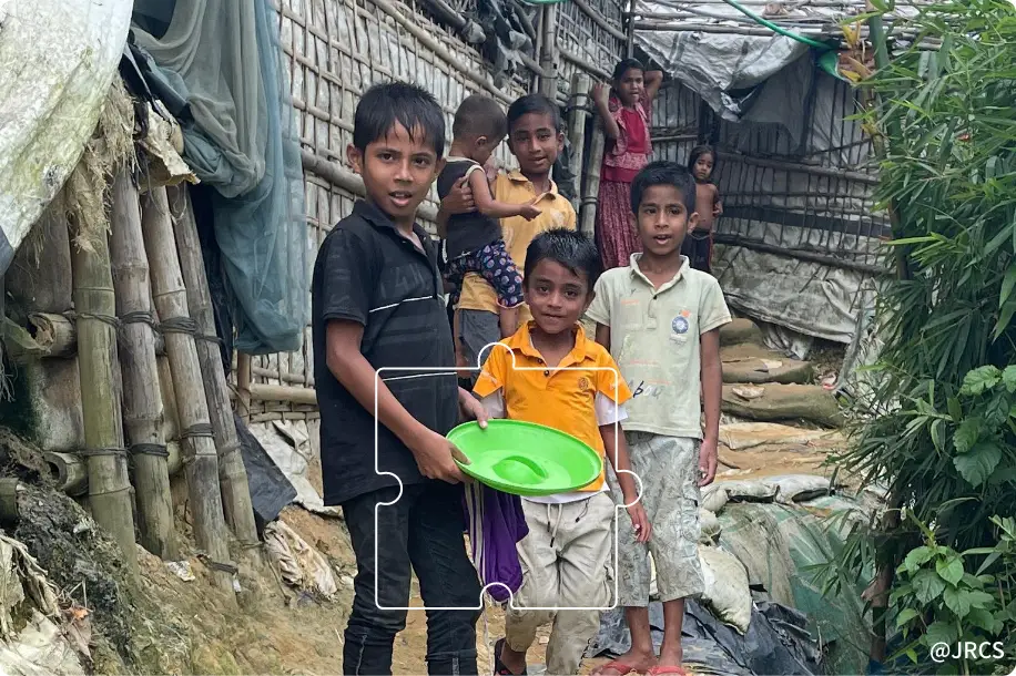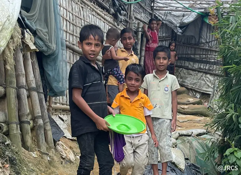 バングラデシュ南東部コックスバザールの避難民キャンプでは、女性や子どもを含む100万人超が竹とビニールの家に住み、劣悪な衛生環境で暮らしています。偏った栄養や壊れやすい住居により、健康や災害時のリスクも高まっています。