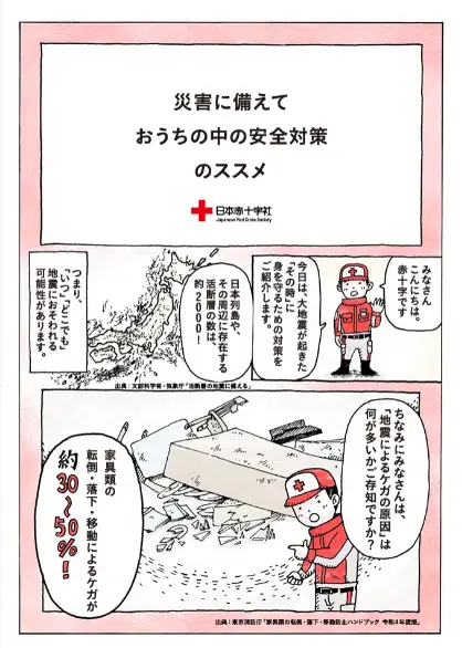 - 転倒した家具で怪我をしないように、本棚などは扉の近くに置く