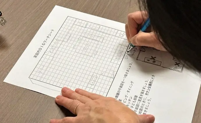 自宅(部屋)の平面図を描くゲームを通じて、地震で起こる被害や家具の安全対策の必要性を把握・理解し、身の安全を守る方法を学びます。参加者の声自宅の危険な場所が分かり、帰ったら改めて家具の固定ができているか確認してみようと思いました。 -