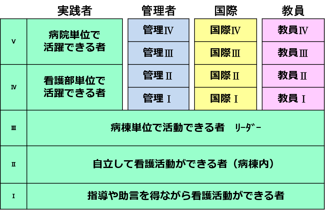 看護実践者のキャリア開発ラダーは、5段階の到達目標(レベルI~V)を設定し、目標を達成するための教育研修と一対になっており、職場の上司や先輩の支援を受けながら、段階的に取り組むことができます。