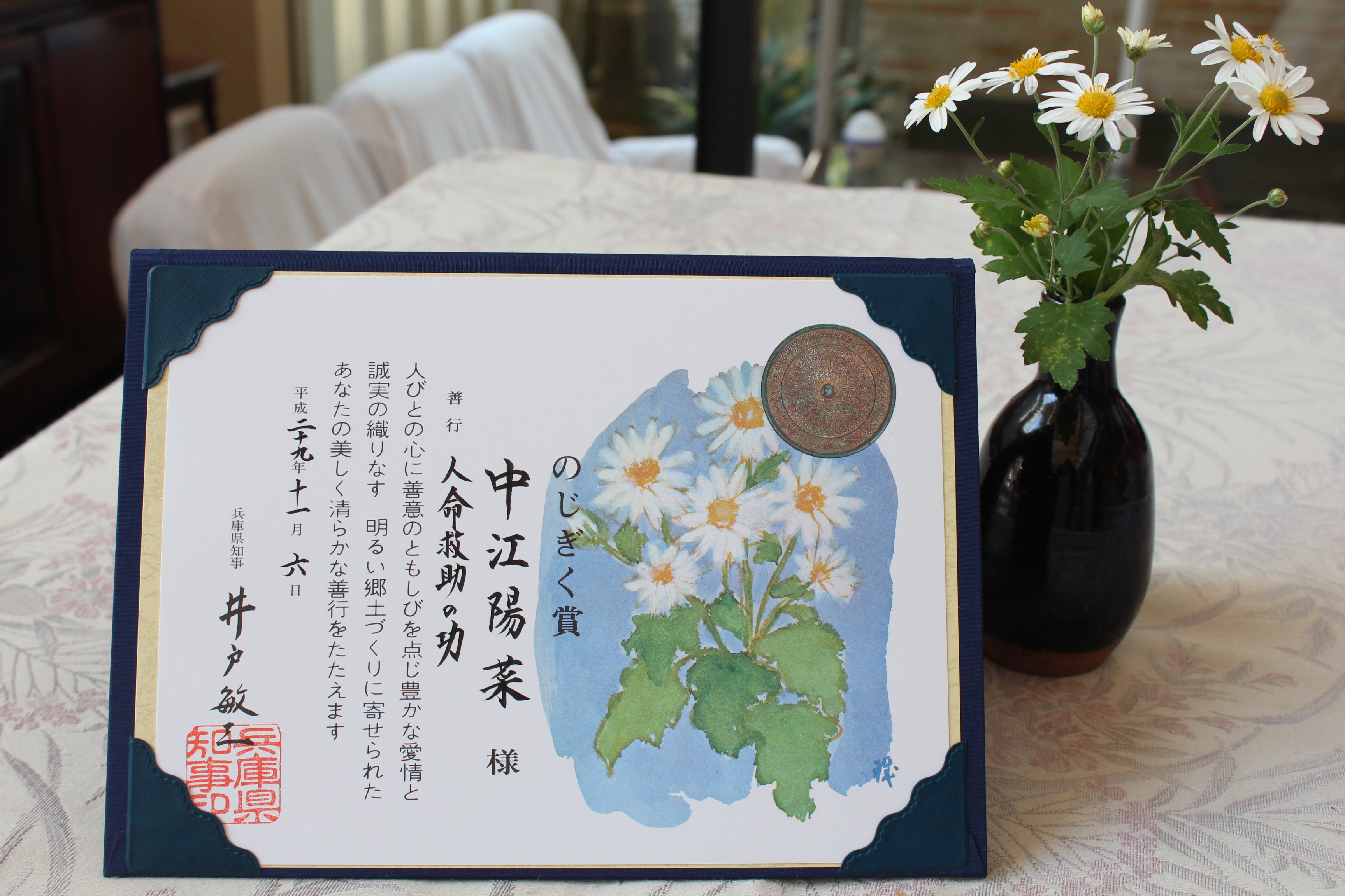 一時心肺停止となった男性を救助したとして、姫路赤十字看護専門学校1年、中江陽菜さんに、兵庫県から善行をたたえる「のじぎく賞」が贈られました。