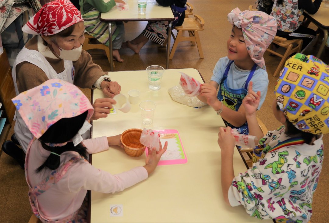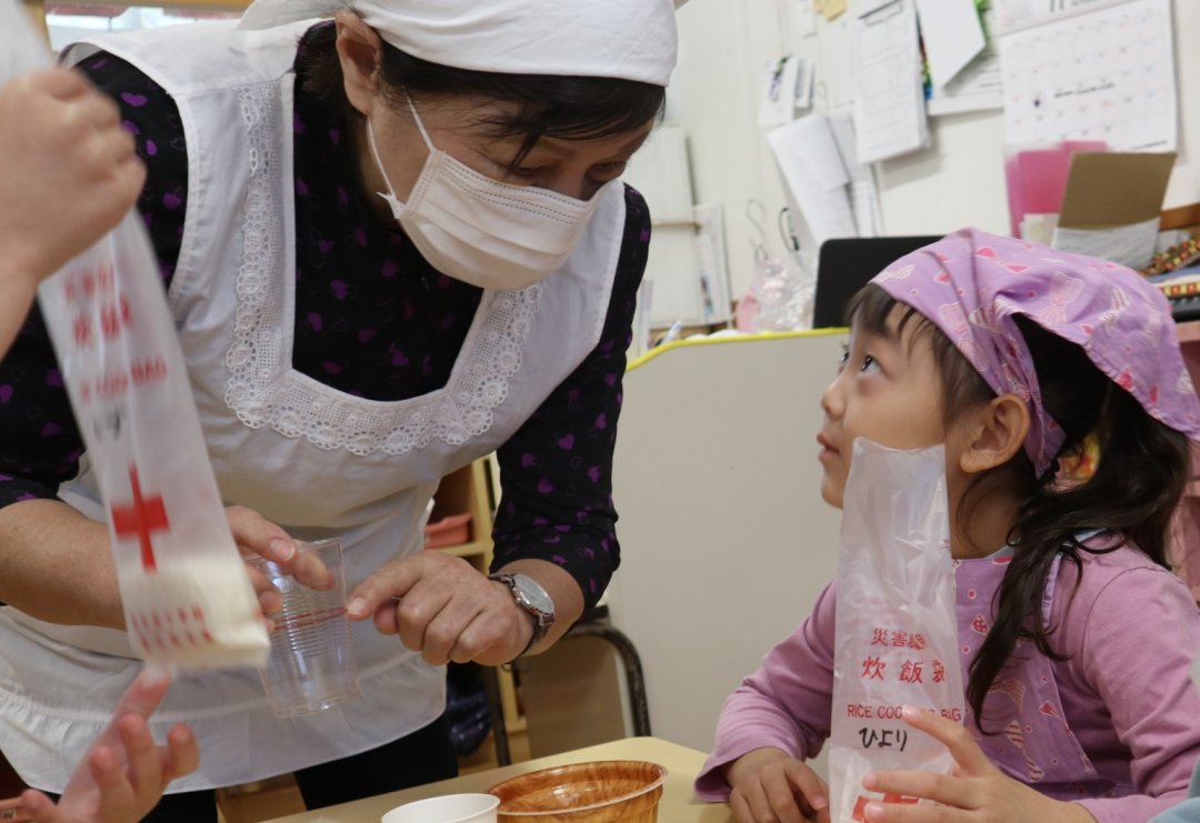 園の職員が防災についてのお話をした後、奉仕団の皆さんが子どもたちに優しく声をかけながら、お米を袋に入れてご飯を炊く準備を進めます。「お米と水をポリ袋に入れるだけで、ご飯が炊けるの!?」と子どもたちは目を輝かせて楽しそうに炊き出し訓練に取り組んでいます。