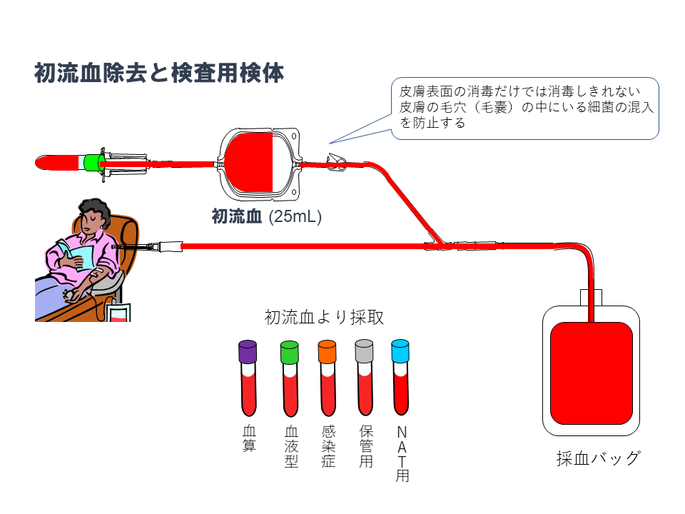 - 皮膚に付着している細菌等の原料血液への混入防止のため、採血時の入念な消毒に加え、針刺し直後の採取血液は原料血液とならぬよう除去しています。(初流血除去)