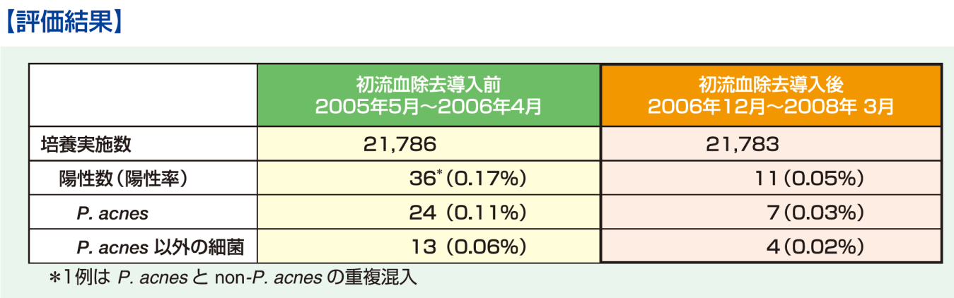 初流血除去は2006年10月より、最初に血小板製剤に導入されました(現在はすべての製剤に導入済み)。室温保管の血小板製剤は、他の製剤に比べても細菌汚染のリスクが高い製剤といえます。期限切れとなった血小板製剤を採血後6日まで室温(20~25℃)で保存し、全自動血液培養装置(BacT/ALERT)を用い、好気的、嫌気的条件それぞれ10mLの製剤を最長7日間細菌培養したところ、初流血除去の導入前後で陽性率は0.17%から0.05%に低下しました。この結果は、初流血除去による安全性の向上を示しています。