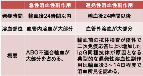 溶血性副作用(Hemolytic transfusion reactions:HTR)は、主に免疫学的な原因により発生し、発症時間により急性溶血性副作用と遅発性溶血性副作用に分類されます(表1参照)。輸血に関連した溶血は免疫学的原因以外にも、細菌感染症や加圧等の物理的要因によっても起こることがあります。