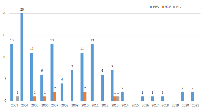 輸血が原因と考えられたHBV、HCV、HIV感染者数は以下のとおりです。