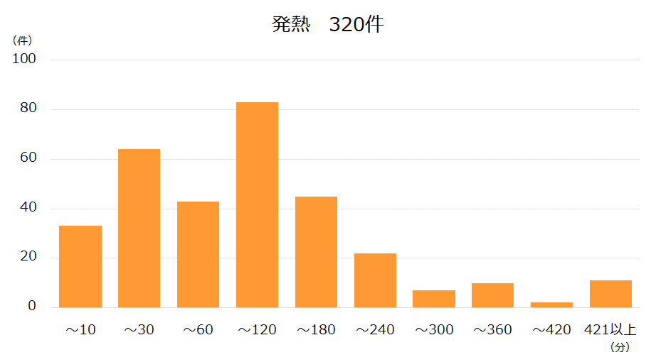 日本赤十字社に2024年に報告された305件の発熱副作用の発現時間を図1に示します。