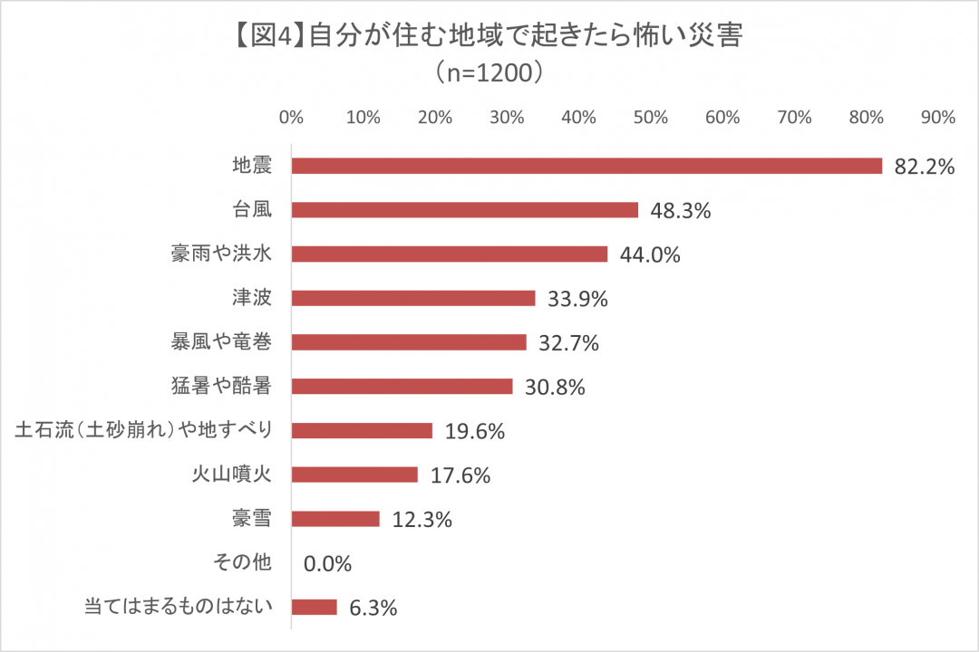- 自分が住む地域で「起きたら怖いと思う災害」は、1位が「地震(82.2%)」となり、「台風(48.3%)」「豪雨や洪水(44.0%)」「津波(33.9%)」「暴風や竜巻(32.7%)」と続いた【図4】