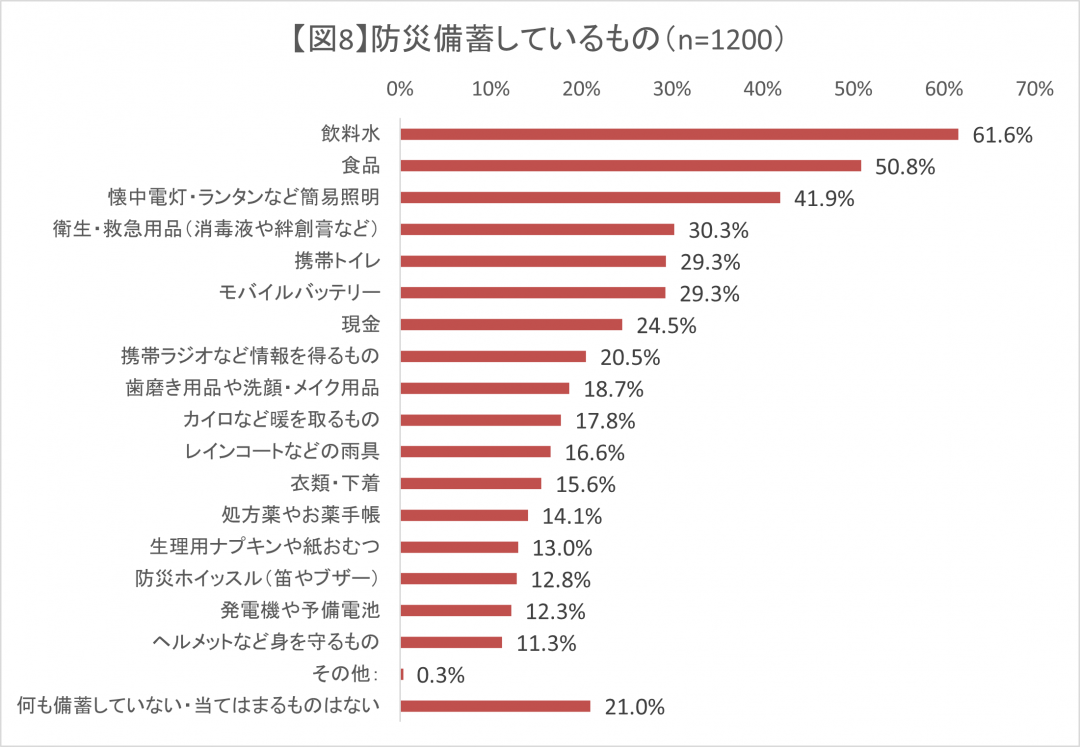- 【自助】の取り組みとして「防災備蓄しているもの」を聞いたところ、「飲料水(61.6%)」が最も多く、「食品(50.8%)」「懐中電灯・ランタンなど簡易照明(41.9%)」が続いたが、それ以外の内容については数値が下がり3割より少ない【図8】