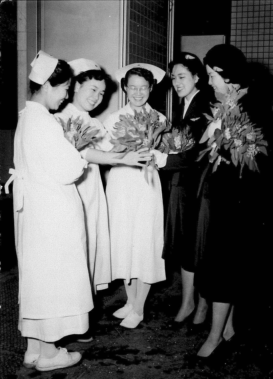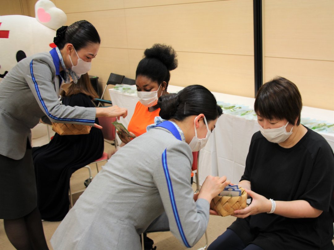 ANAの客室乗務員からすずらんを受け取る救護員制服姿の日赤看護師