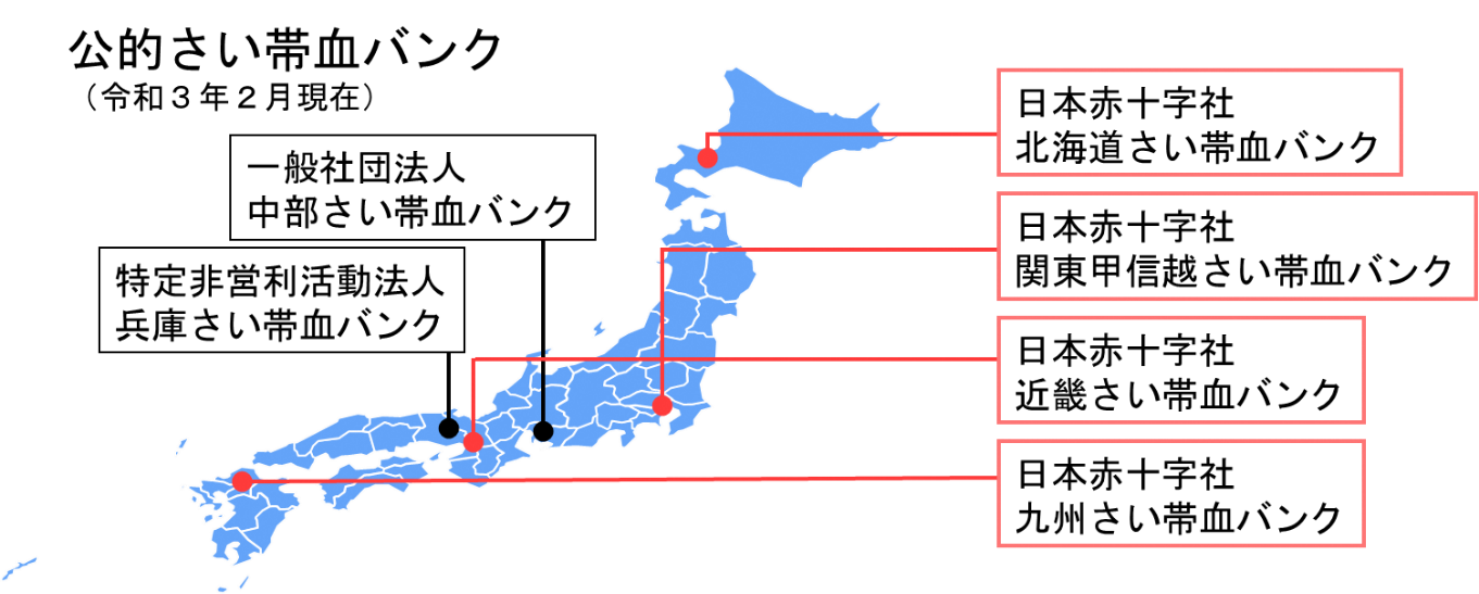 さい帯血の提供が可能な産院(公的さい帯血バンクと提携している採取施設)は全国に97施設あり、提供いただいたさい帯血は、全国6か所の公的さい帯血バンク【図2】において、受入れ~調製~保存を行い、患者さんに適合するさい帯血が見つかった際には移植医療施設に供給いたします。