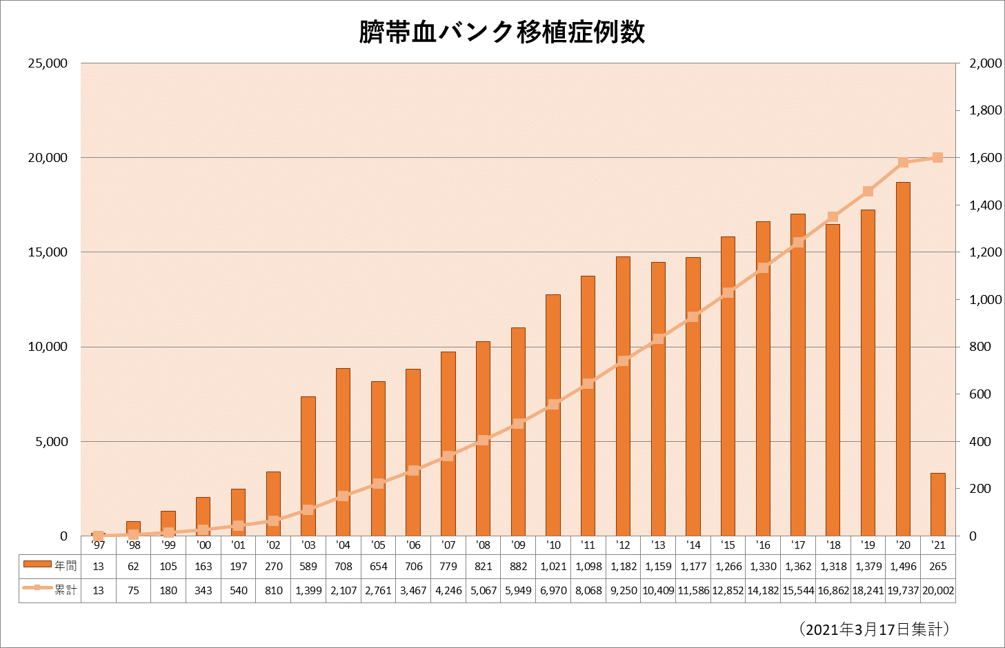 お母さんと赤ちゃんを結ぶへその緒と胎盤の血液「さい帯血」は、白血病などの患者さんの移植治療に使われます。1997年に最初の非血縁者間さい帯血移植が始まって以降、2021年3月17日に累計移植症例数が2万例を超えました【図1】。