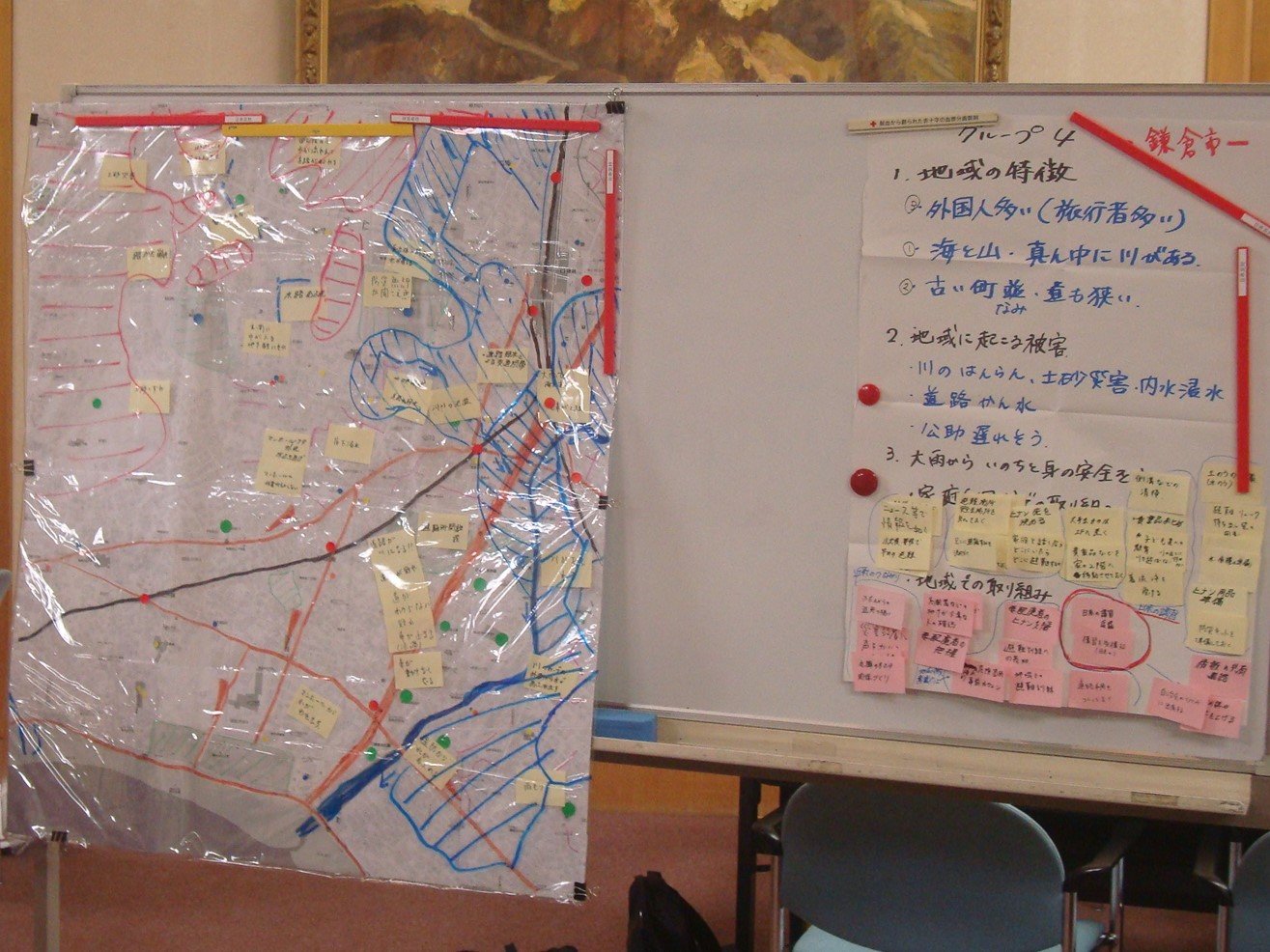 「災害図上訓練(DIG)」(防災マップ作りを通じた災害時のイメージトレーニング)で、カラーペンとシールを使って地域の特徴を地図に表す