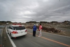 雪まじりの小雨の中、走行ルートである相馬市沿岸部の津波被害地域と30km圏内で輸血用血液の配送にあたる職員の高橋さん。「沿岸部に住んでいた知り合いの旅館は津波に流された。本人は生きているという噂を聞いたが直接連絡はしていない。連絡を取っても何を話せばいいのか分からないし…。生きているという情報が聞けただけでも、とりあえず良しとしなくては」と唇をかみしめます。