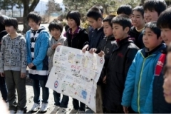 青少年赤十字に加盟する東山東小学校は、3月11日の東日本大震災で被害を受けた大沢小学校に応援メッセージを贈ろうと寄せ書きを作成。山田町で診療活動を展開している日本赤十字社和歌山医療センターの救護班によって28日に届けられました。大沢小学校の児童はさっそくお礼の返事を書き、救護班に託しています。優香さんは「ちがう学校の人たちにも元気をもらったので私たちからもちがう学校の人たちにも元気がでる手紙をいっぱいいっぱい書きたいです。これからもずっと、がんばります」と返事を締めくくっています。