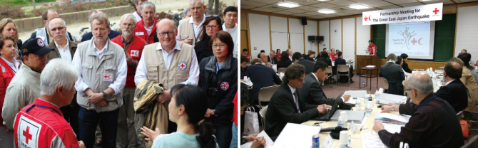 震災から2カ月後の5月、アメリカ、オーストラリア、イギリス、カナダ、中国など支援国の赤十字関係者ら43人が来日。被災地を訪問し、ともに考え、復興支援の基本計画が決定しました。支援国は1年後にも来日し、有効に活用されているか評価しています。