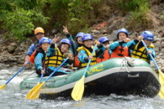 (写真右:全身びしょ濡れになりながら笑顔でラフティング)