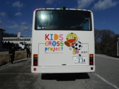 (写真:ゆず太郎キャラクターと日赤のキッズクロスプロジェクトロゴマークがデザインされたスクールバス)