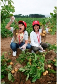 震災で傷ついた子どもたちに北海道の大自然を新しい仲間との出会いの中で楽しく過ごしてもらおうと、日本赤十字社では3泊4日の「サマーキャンプ2012 in クロスヴィレッジ」を7月21日から8月23日まで、ルスツリゾート(虻田郡留寿都)で11回にわたって開催しました。岩手、宮城、福島の小学5年生から中学3年生が毎回300人以上参加。「放射能を気にすることなくのびのび過ごせた」「初対面の友達と仲良くなれた」など、楽しい夏の思い出をたくさん作りました。(写真:北海道の大自然の中で芋ほりを体験)