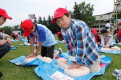 子どもたちは大自然の中での渓流えさ釣りや乗馬、農作物収穫、酪農体験など4日間のプログラムを通して、思い切り体を動かしました。自分や周りの人を助けられるようになるため、救急法も学習。心肺蘇生法やAED(自動体外式除細動器)の使い方、三角巾による止血法などを体験しました。(写真:AEDの使い方を練習)