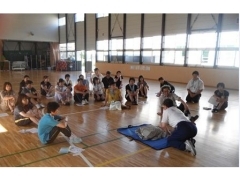 車両には、日赤の取り組みの一環として、AED(自動体外式除細動器)を搭載しており、今回、日赤が建設を支援した仮設体育館を利用して、ドライバーさんや先生方に使用方法を学んでいただく機会を設けました。(写真:AED講習会の様子)