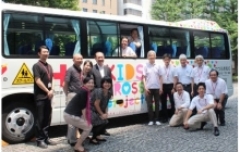 スクールバスを際立たせるカラフルなハートいっぱいのラッピングは、日赤キッズクロスプロジェクトの教育支援事業を象徴するデザインマークです。デザイナーの梶谷芳郎さんに昨年7月に制作してもらいました。(写真:H24.7.26バス検収に立ち会った東日本大震災復興支援推進本部のスタッフと記念写真。車体中央「キッズクロスロゴ」右隣が梶谷さん)
