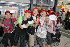(写真:出発前の仙台空港で航空券を手にはしゃぐ子どもたち)