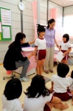 宮城県石巻市立渡波小学校では、10月7日に1年生の身体測定が行われました。8月末に完成した仮設校舎には、すでに真新しい身長計や視力計、ベッドなどが配備されています。「背が伸びたかな?」、子どもたちは久しぶりの身体測定にちょっぴり緊張気味。お行儀よく並んで、身長と体重を測ってもらいました。