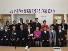 山田北小学校放課後児童クラブのお披露目式であいさつした佐藤信逸 山田町長は、「東日本大震災から3年2カ月が経過し、当町をはじめ被害に遭った地域への支援が得られにくくなっている中、このような温かいご厚志に大変感謝申し上げます」と支援への感謝を表明。