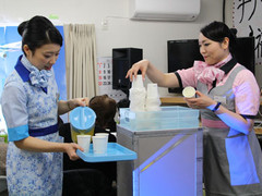 ANAのスタッフが機内用カートを使って参加者にサービス
