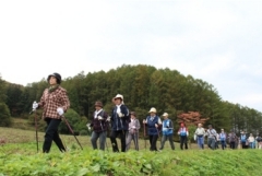 日本赤十字社岩手県支部は平成23年11月から、県内の仮設住宅で暮らす高齢者の健康増進とリフレッシュを目的に、ノルディックウォーキングによる健康生活支援を行っています。10月25日は釜石市と大槌町の3つの仮設住宅の居住者を対象にした合同イベントを、遠野市で開催。約30人の参加者が、カッパ伝承が息づくカッパ淵など「新・奥の細道」コース(約3.1キロ)で汗を流しました。