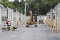 (写真:高田第一中学校の校庭に建てられたプレハブの仮設住宅)