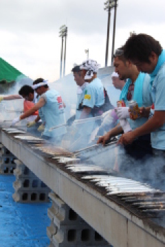 (写真:一昨年、昨年は3000匹のサンマの塩焼きが振る舞われましたが、今年は5000匹が午後の早い時間に無くなるほどの大盛況。来年は浜辺の会場での開催を予定)