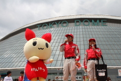 応援デーには日赤東京都支部のボランティアや職員68人も参加。入場ゲート前広場にブースを設け、パネルやポスターを使って赤十字の救護活動や巨人軍の赤十字支援プロジェクトを紹介しました。また、同広場でのステージイベント「ステージG-king」では、日赤の献血推進キャラクター「けんけつちゃん」と巨人軍のマスコットガールがコラボ。仲良くファンに呼びかけました。