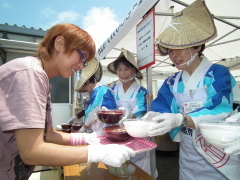 (写真:阿波踊りの浴衣で料理を提供する徳島のボランティア)