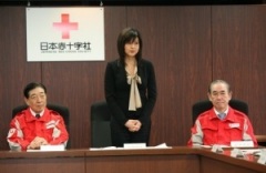 本社では災害対策本部会議にも出席。震災の救援活動の説明を受け、「避難生活を強いられている方はもちろん、救護にあたる方にも、“こころのケア”が大切だと聞きました。少しでも被災地の方が笑顔になれるよう現地で活動したい」と決意を語りました。