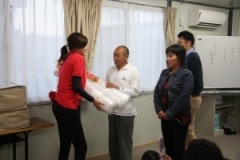 206戸が入る北飯渕仮設住宅を訪問し、仮設住宅組長の佐藤泰治さんと星すえ子さんに断熱シートなどを手渡しました。大勢の入居者の皆さんからの大きな拍手と歓声で迎えられた藤原さんは、「これからも皆さんのことをずっと忘れず、一刻も早く復興に向けて動き出すように、いろんなことを伝えていきます」と激励しました。