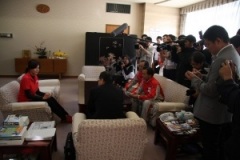 紀香さんと知事の懇談には県内の多数の新聞やテレビが取材に駆けつけ、注目の高さを示しました。