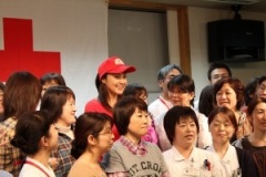 集会所で開かれた日赤福島県支部の「にこにこ健康教室」にも参加し、高齢者の方々へのリラクゼーションを手伝いました。手馴れた手つきで参加者の背中をさする紀香さんに、周囲から「上手だねぇー」「私にもやってほしい」と声がかかりました。